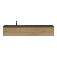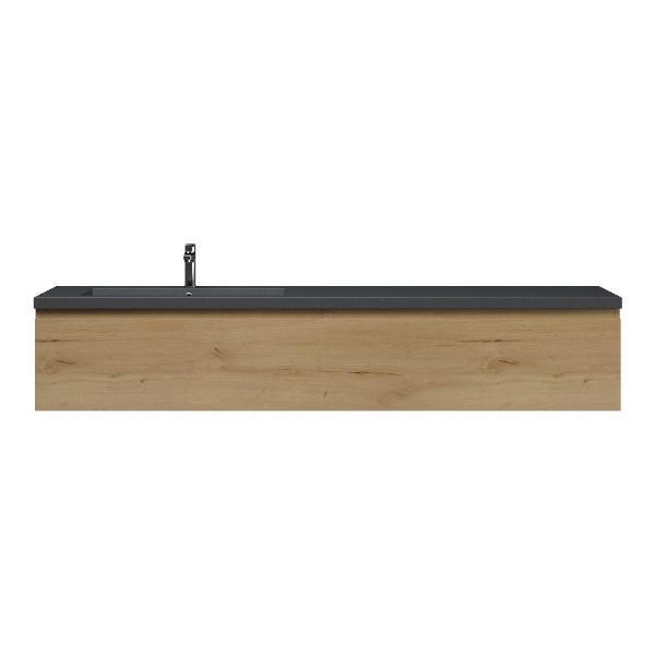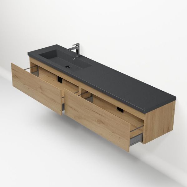 Greeploos badkamermeubel in de kleur eiken natuur is 200 cm breed.  De wastafel is vervaardig in quartz en heeft de kleur grijs mat quartz. Dit badkamermeubel met deze wastafel is leverbaar tussen de 60 cm t/m 160 cm