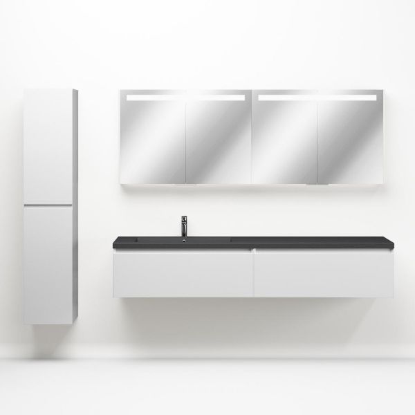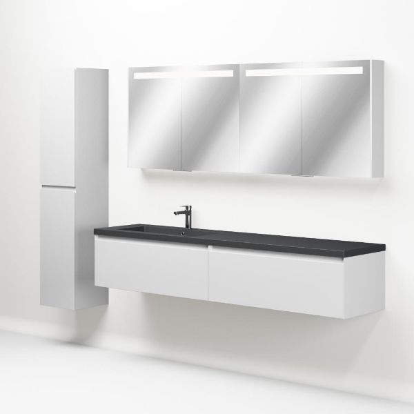 Greeploos badkamermeubel in de kleur wit hoogglans is 200 cm breed. De wastafel is vervaardig in quartz en heeft de kleur grijs mat quartz. Dit badkamermeubel met deze wastafel is leverbaar tussen de 60 cm t/m 160 cm