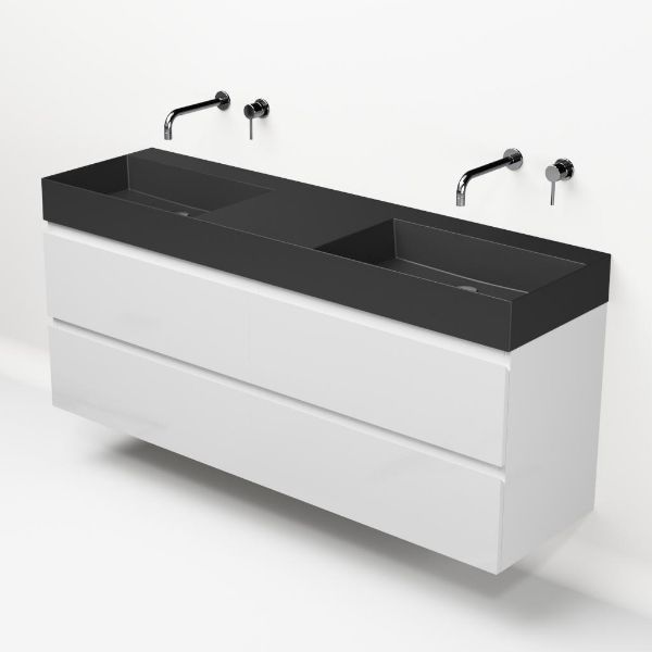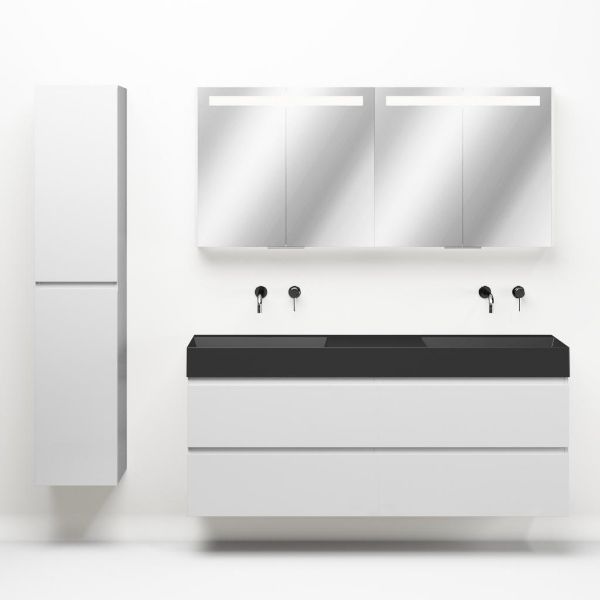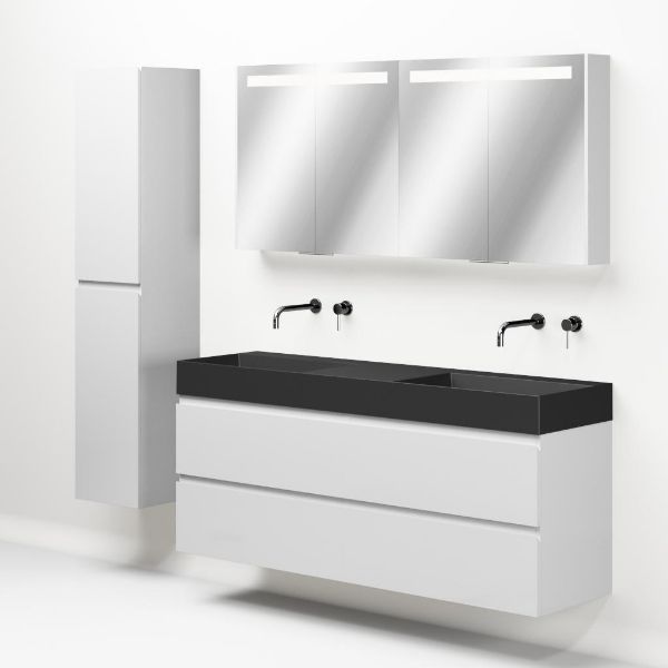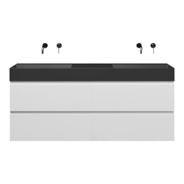 Greeploos badkamermeubel in de kleur wit hoogglans is 160 cm breed. De wastafel is vervaardig in keramiek en heeft de kleur antraciet mat keramiek. Dit badkamermeubel met deze wastafel is leverbaar tussen de 60 cm t/m 160 cm