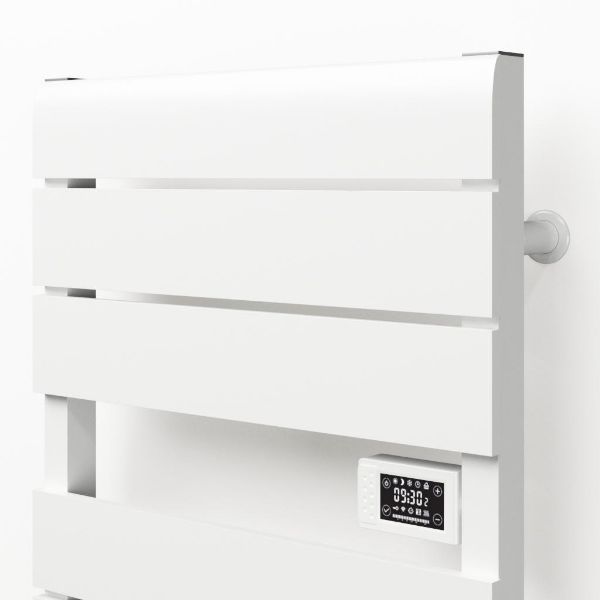 De Vastra badkamer radiator is voorzien van brede horizontale lamellen die het model zijn opvallende uiterlijk geven. Door supergeleidend aluminium te combineren met elektroden, zonder gebruik te maken van een vloeistof, ontstaat een snelle manier van verwarmen. Met de klokthermostaat regelt u de aan/uit tijden en temperatuurinstelling. Deze is met een Wi-Fi verbinding op afstand te bedienen. De radiator moet worden aangesloten op een geaard stopcontact en levert een maximale warmteafgifte van 800 watt. Dit model heeft een maatvoering van 160 x 55 cm en de toplaag is uitgevoerd in de kleur wit mat.