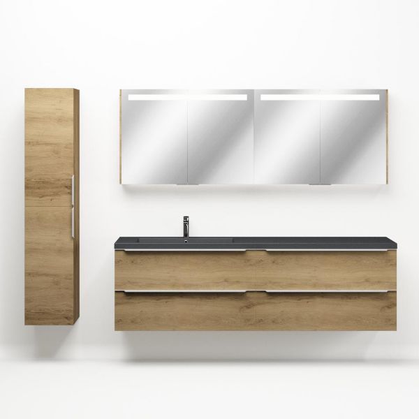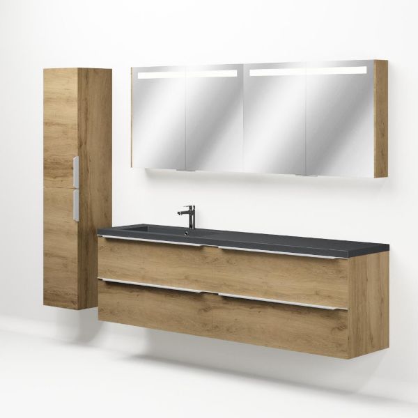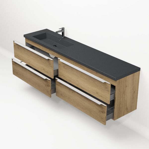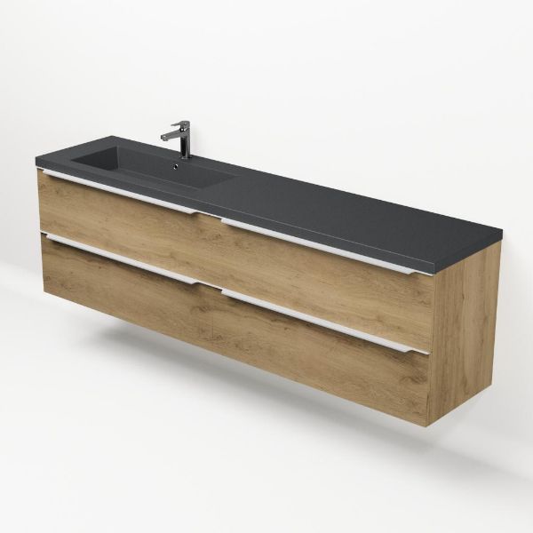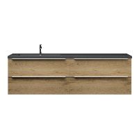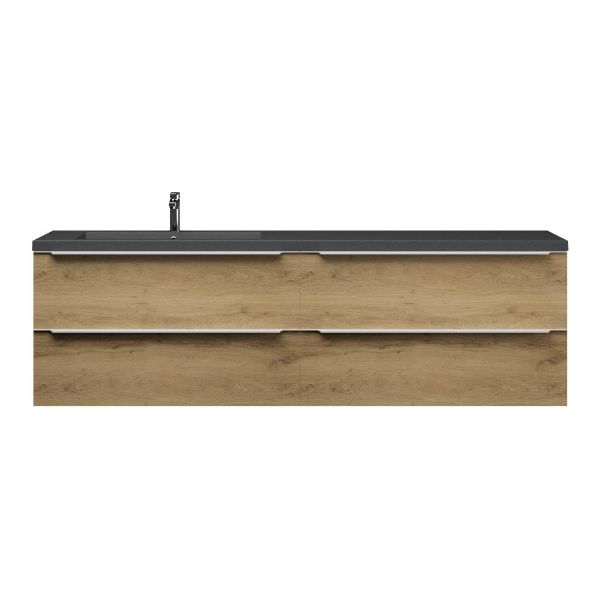 Badkamermeubel met inleggreep naar keuze, in de kleur eiken warm in 200 cm breed.  De wastafel is vervaardig in quartz en heeft de kleur grijs mat quartz. Dit badkamermeubel met deze wastafel is leverbaar tussen de 60 cm t/m 140 cm