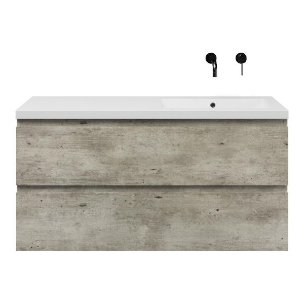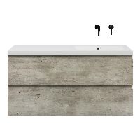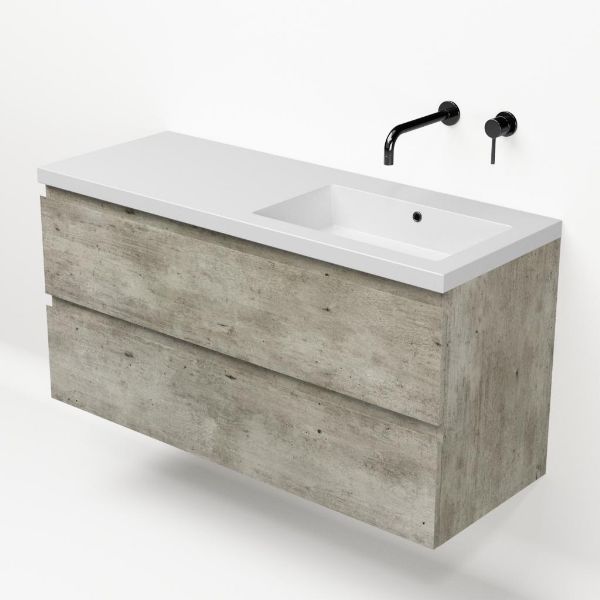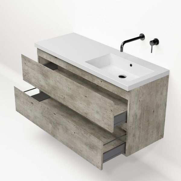 | | Bellanti Fiore /Esta-Q badmeubel 120x46 2 softclose laden steigerhout licht grijs greeploos polystone wastafel mat wit rechts zonder kraangaten |