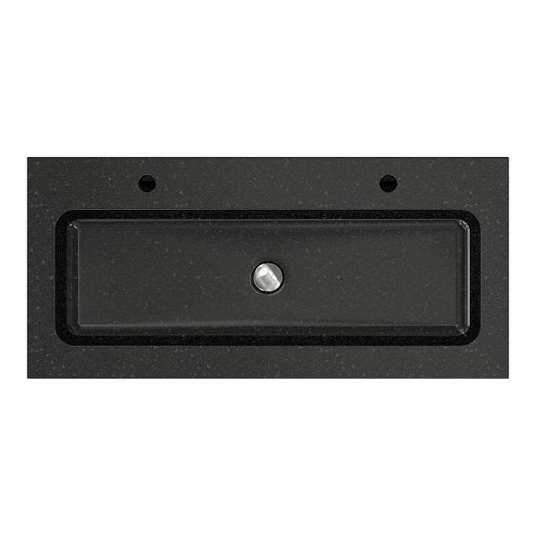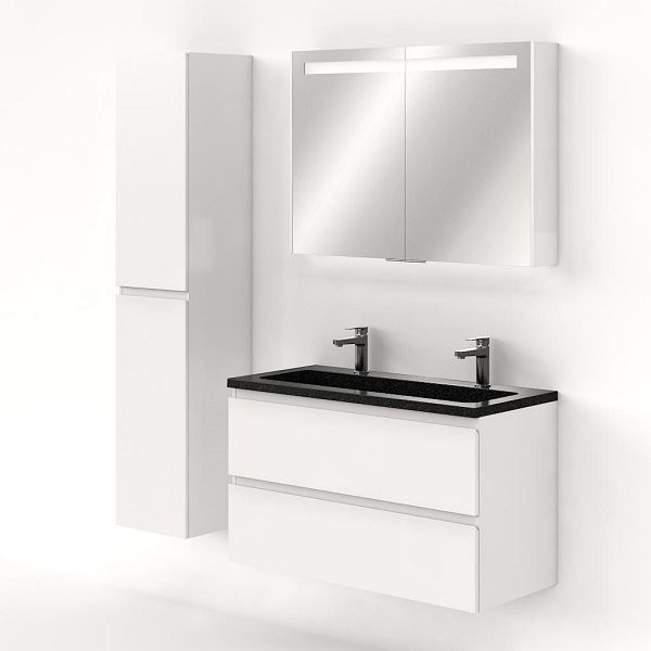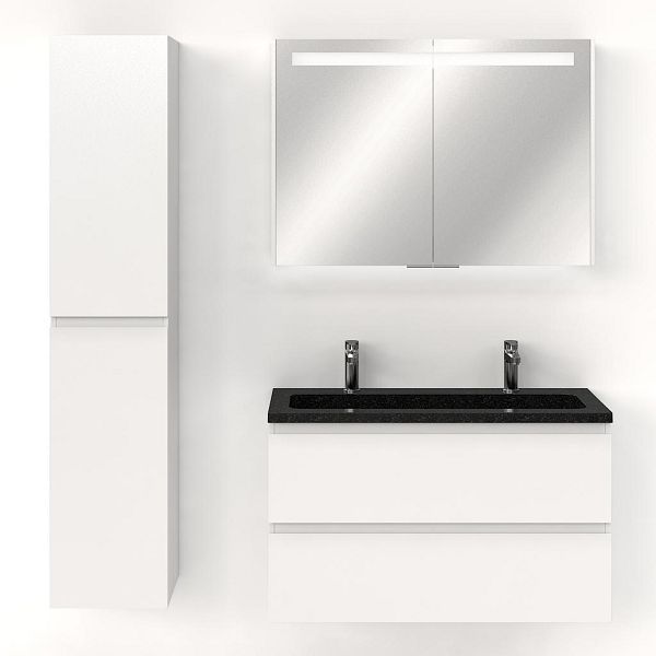 Greeploos badkamermeubel in de kleur wit hoogglans is 100 cm breed. De wastafel is vervaardig in natuursteen en heeft de kleur shanxi black. Dit badkamermeubel met deze wastafel is leverbaar tussen de 60 cm t/m 120 cm