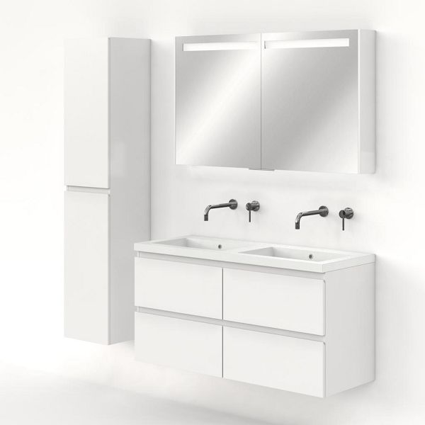 Greeploos badkamermeubel in de kleur wit hoogglans is 120 cm breed.  De wastafel is vervaardig in polystone en heeft de kleur wit. Dit badkamermeubel met deze wastafel is leverbaar tussen de 60 cm t/m 200 cm