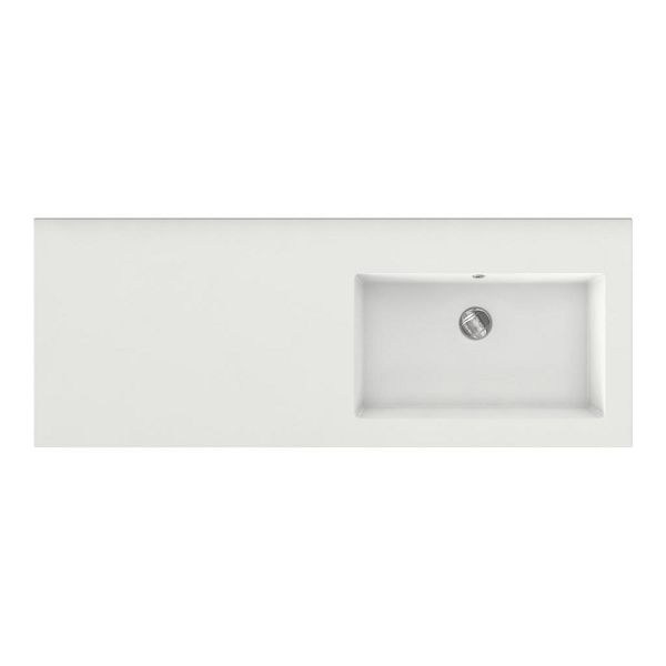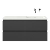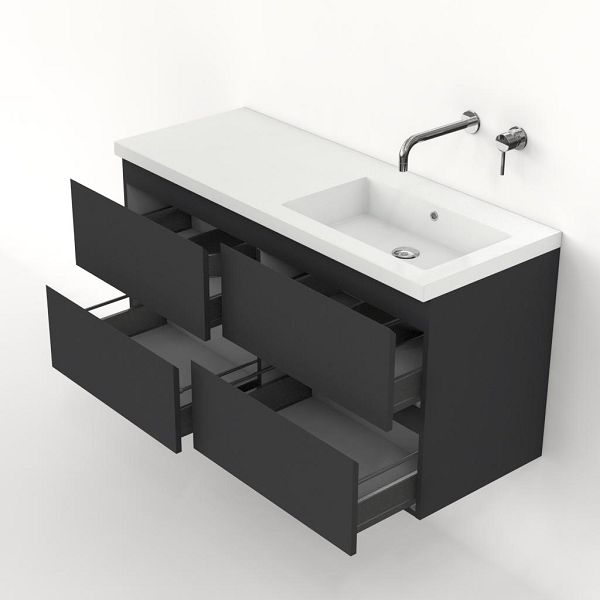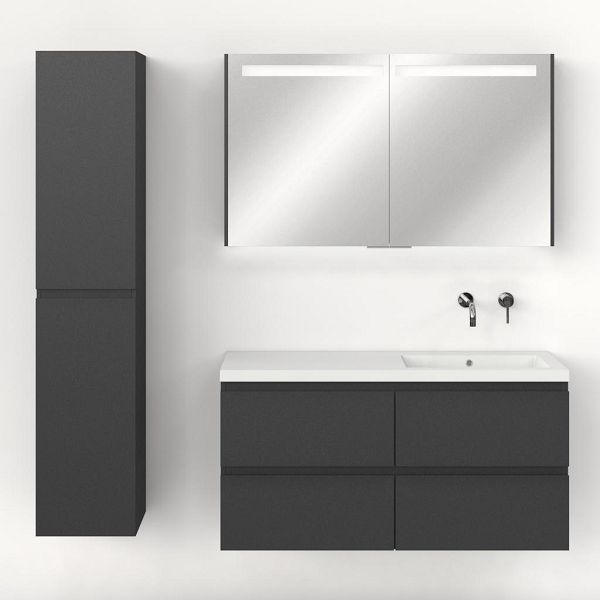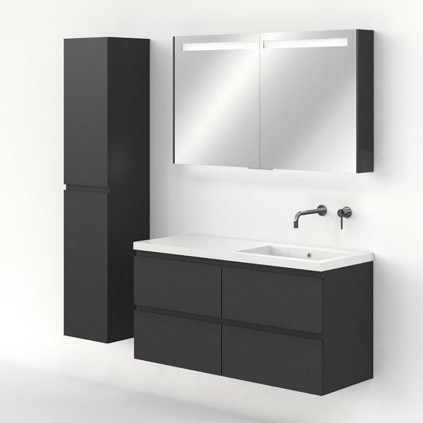 Greeploos badkamermeubel in de kleur antraciet mat is 120 cm breed.  De wastafel is vervaardig in polystone en heeft de kleur wit. Dit badkamermeubel met deze wastafel is leverbaar tussen de 60 cm t/m 200 cm