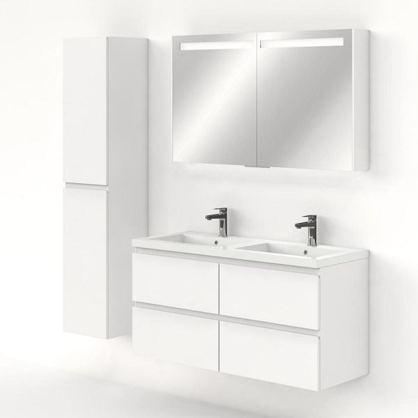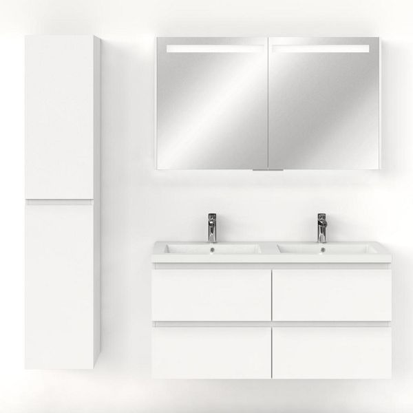 Greeploos badkamermeubel in de kleur wit mat is 120 cm breed.  De wastafel is vervaardig in polystone en heeft de kleur wit. Dit badkamermeubel met deze wastafel is leverbaar tussen de 60 cm t/m 200 cm