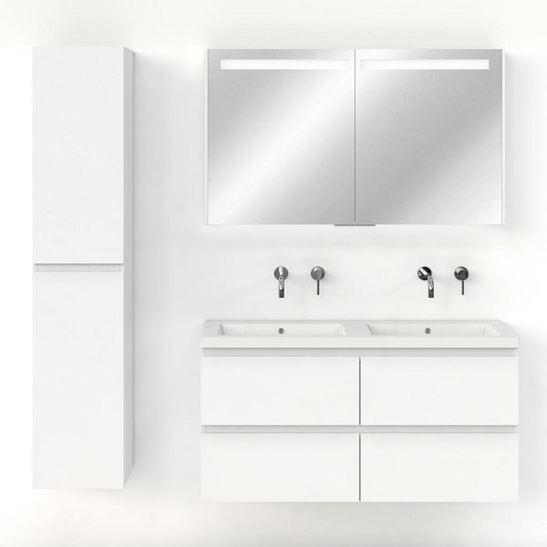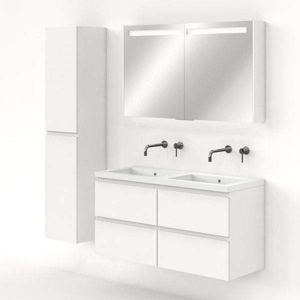 Greeploos badkamermeubel in de kleur wit mat is 120 cm breed. De wastafel is vervaardig in polystone en heeft de kleur wit. Dit badkamermeubel met deze wastafel is leverbaar tussen de 60 cm t/m 200 cm