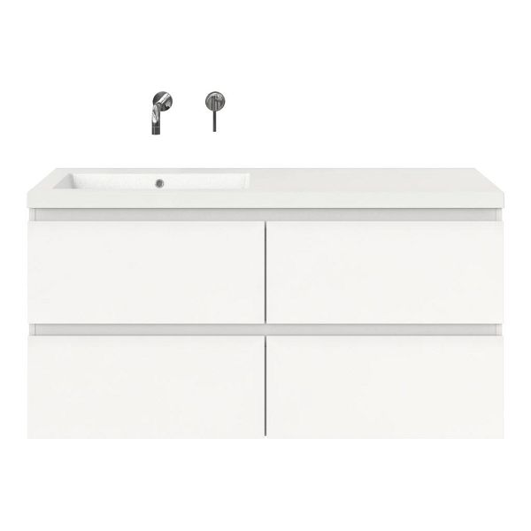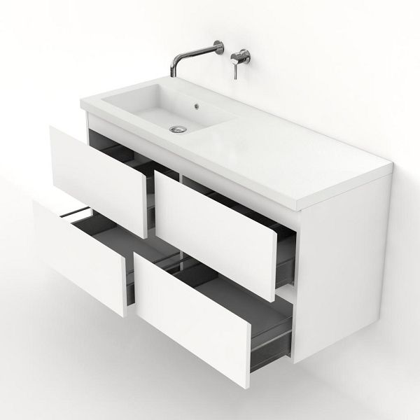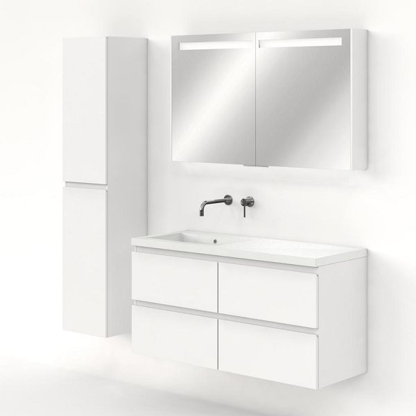 Greeploos badkamermeubel in de kleur wit mat is 120 cm breed. De wastafel is vervaardig in polystone en heeft de kleur wit. Dit badkamermeubel met deze wastafel is leverbaar tussen de 60 cm t/m 200 cm