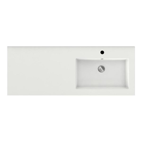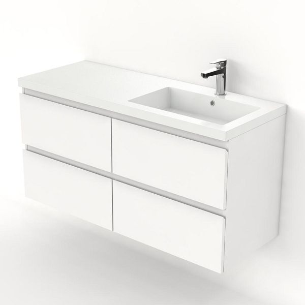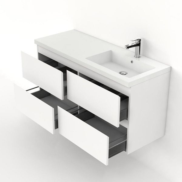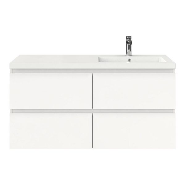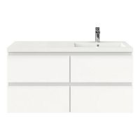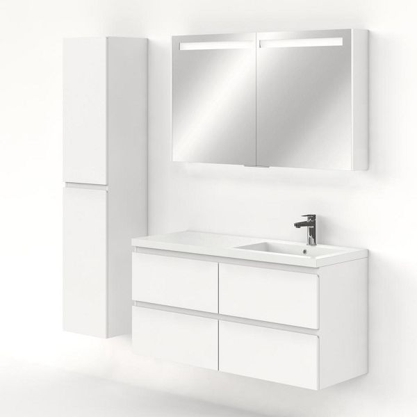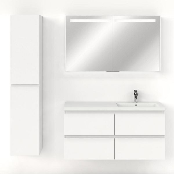 Greeploos badkamermeubel in de kleur wit mat is 120 cm breed. De wastafel is vervaardig in polystone en heeft de kleur wit. Dit badkamermeubel met deze wastafel is leverbaar tussen de 60 cm t/m 200 cm
