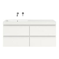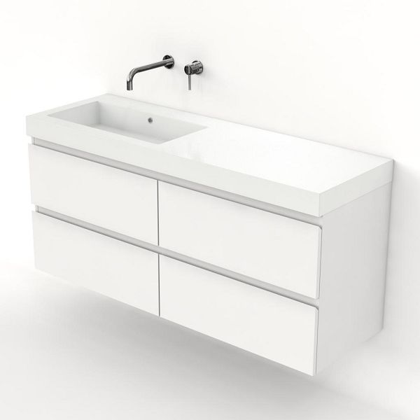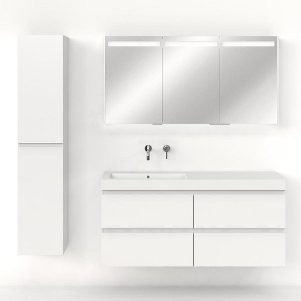 Greeploos badkamermeubel in de kleur wit hoogglans is 140 cm breed. De wastafel is vervaardig in polystone en heeft de kleur wit. Dit badkamermeubel met deze wastafel is leverbaar tussen de 60 cm t/m 200 cm