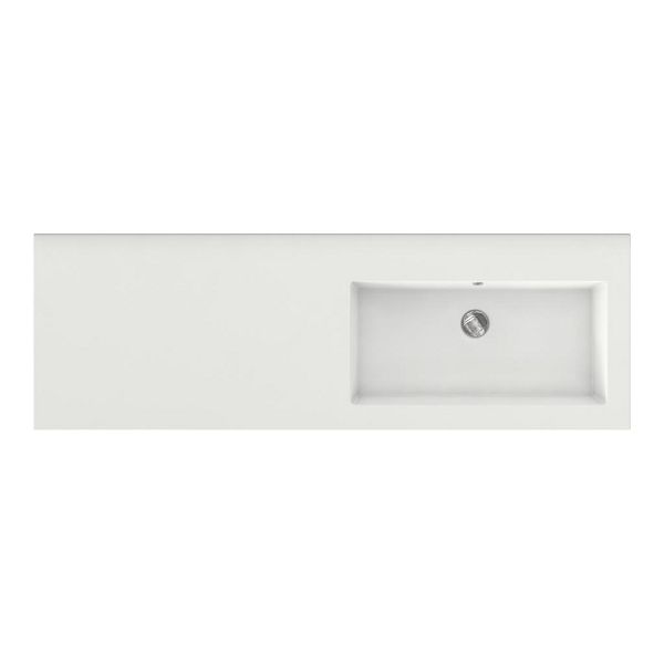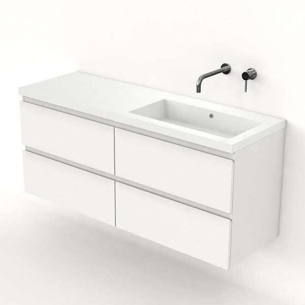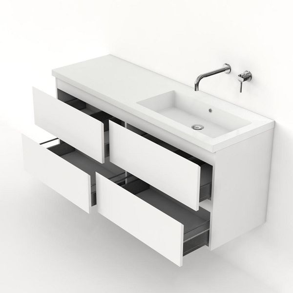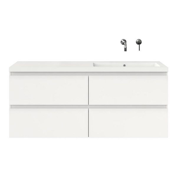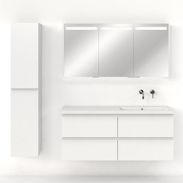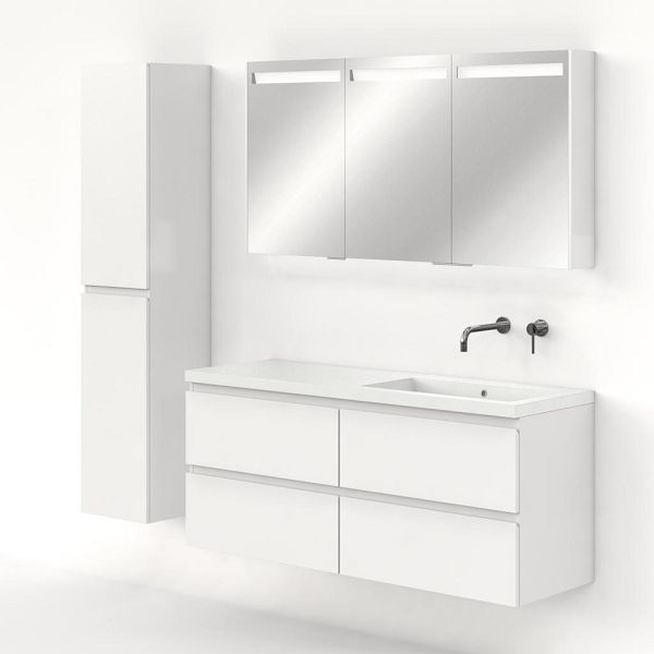 Greeploos badkamermeubel in de kleur wit hoogglans is 140 cm breed.  De wastafel is vervaardig in polystone en heeft de kleur wit. Dit badkamermeubel met deze wastafel is leverbaar tussen de 60 cm t/m 200 cm