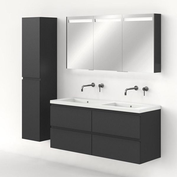 Greeploos badkamermeubel in de kleur antraciet mat is 140 cm breed.  De wastafel is vervaardig in polystone en heeft de kleur wit. Dit badkamermeubel met deze wastafel is leverbaar tussen de 60 cm t/m 200 cm