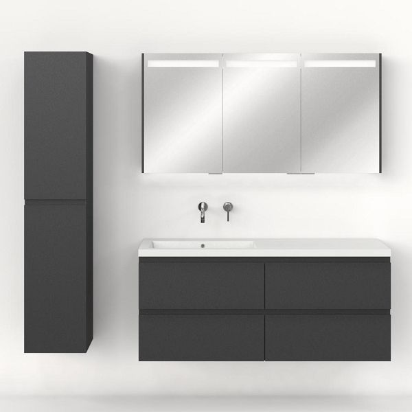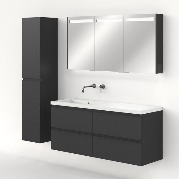 Greeploos badkamermeubel in de kleur antraciet mat is 140 cm breed.  De wastafel is vervaardig in polystone en heeft de kleur wit. Dit badkamermeubel met deze wastafel is leverbaar tussen de 60 cm t/m 200 cm