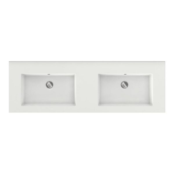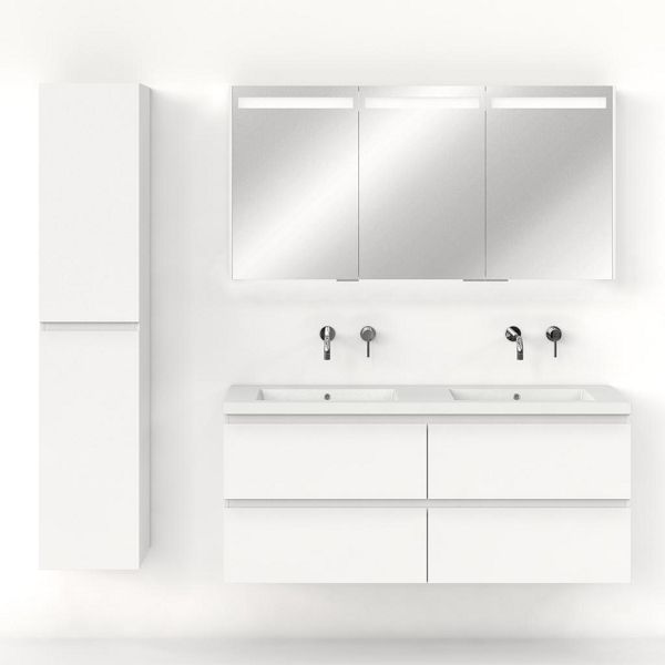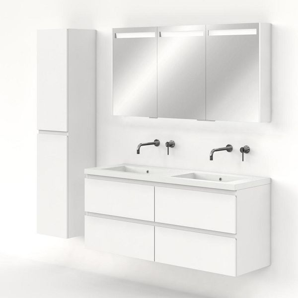 Greeploos badkamermeubel in de kleur wit mat is 140 cm breed. De wastafel is vervaardig in polystone en heeft de kleur wit. Dit badkamermeubel met deze wastafel is leverbaar tussen de 60 cm t/m 200 cm