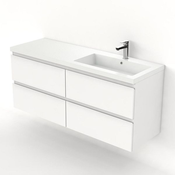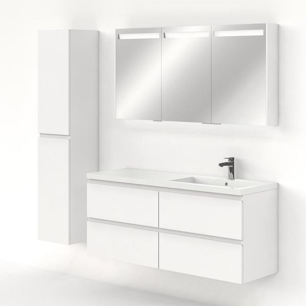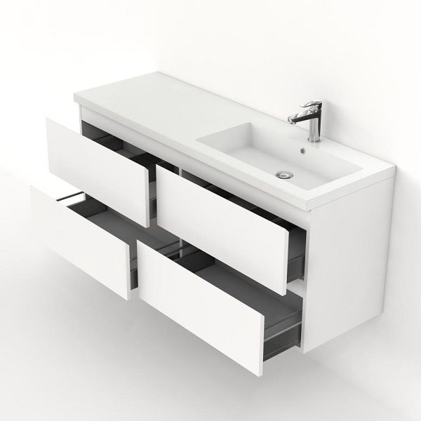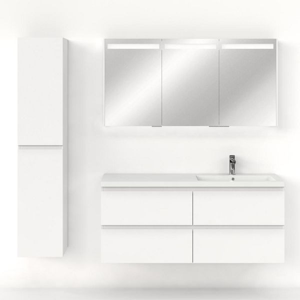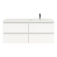 Greeploos badkamermeubel in de kleur wit mat is 140 cm breed. De wastafel is vervaardig in polystone en heeft de kleur wit. Dit badkamermeubel met deze wastafel is leverbaar tussen de 60 cm t/m 200 cm