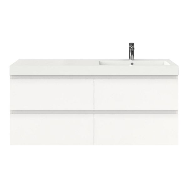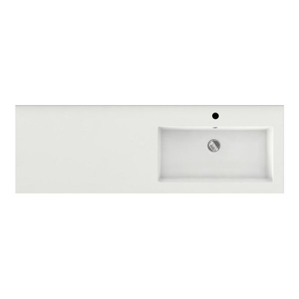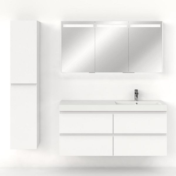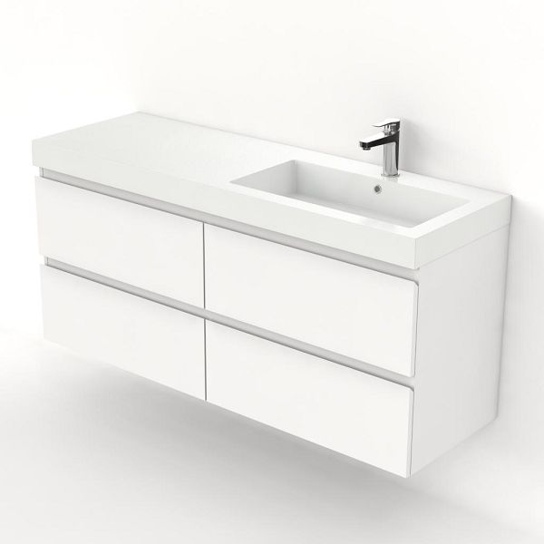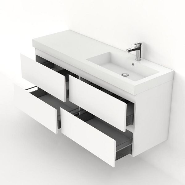 Greeploos badkamermeubel in de kleur wit mat is 140 cm breed.  De wastafel is vervaardig in polystone en heeft de kleur wit. Dit badkamermeubel met deze wastafel is leverbaar tussen de 60 cm t/m 200 cm