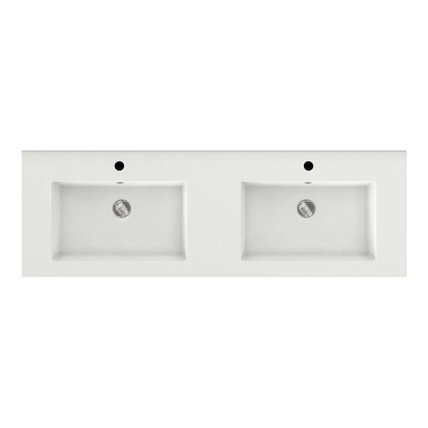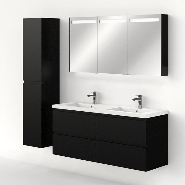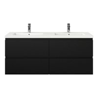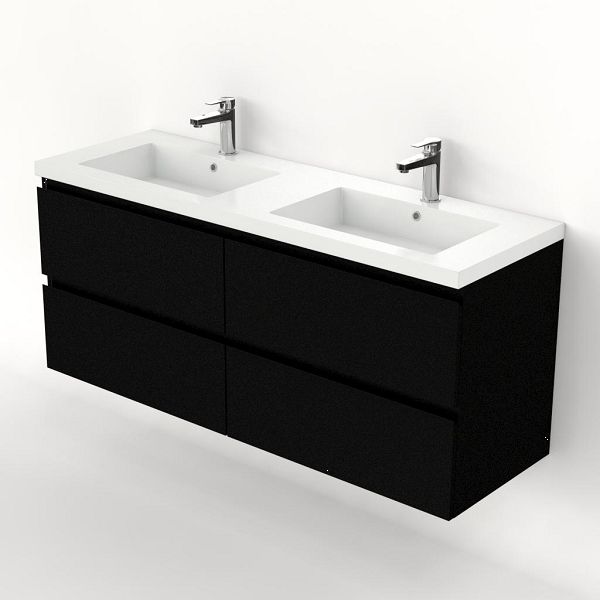 Greeploos badkamermeubel in de kleur zwart mat is 140 cm breed.  De wastafel is vervaardig in polystone en heeft de kleur wit. Dit badkamermeubel met deze wastafel is leverbaar tussen de 60 cm t/m 200 cm