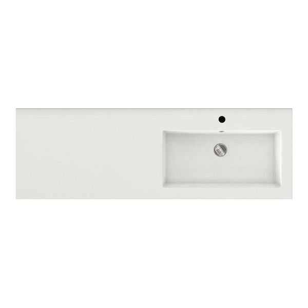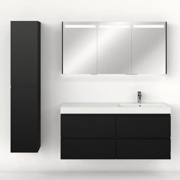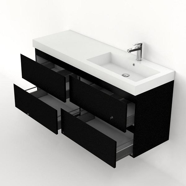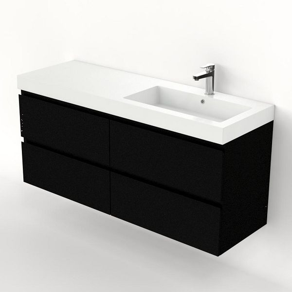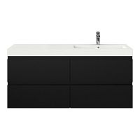 Greeploos badkamermeubel in de kleur zwart mat is 140 cm breed. De wastafel is vervaardig in polystone en heeft de kleur wit. Dit badkamermeubel met deze wastafel is leverbaar tussen de 60 cm t/m 200 cm