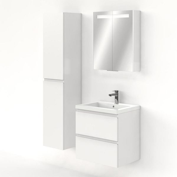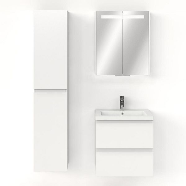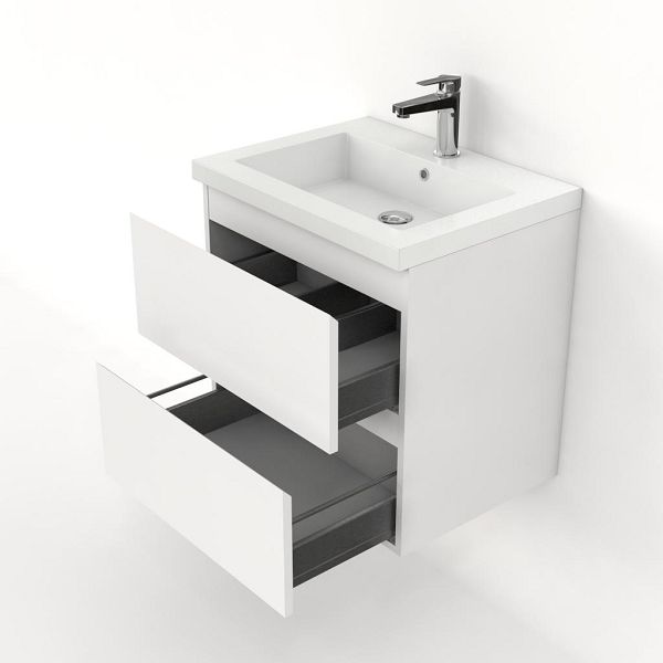 Greeploos badkamermeubel in de kleur wit hoogglans is 60 cm breed.  De wastafel is vervaardig in polystone en heeft de kleur wit. Dit badkamermeubel met deze wastafel is leverbaar tussen de 60 cm t/m 200 cm