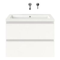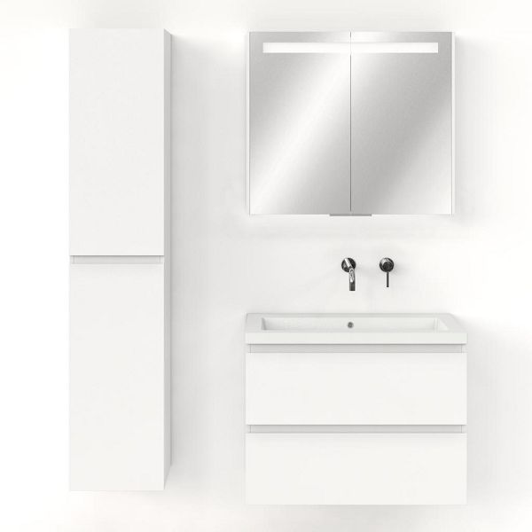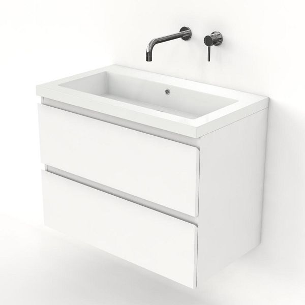 Greeploos badkamermeubel in de kleur wit mat is 80 cm breed.  De wastafel is vervaardig in polystone en heeft de kleur wit. Dit badkamermeubel met deze wastafel is leverbaar tussen de 60 cm t/m 200 cm