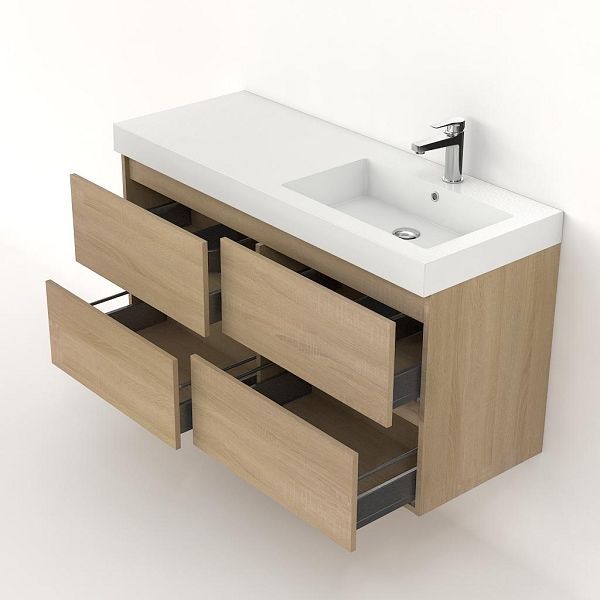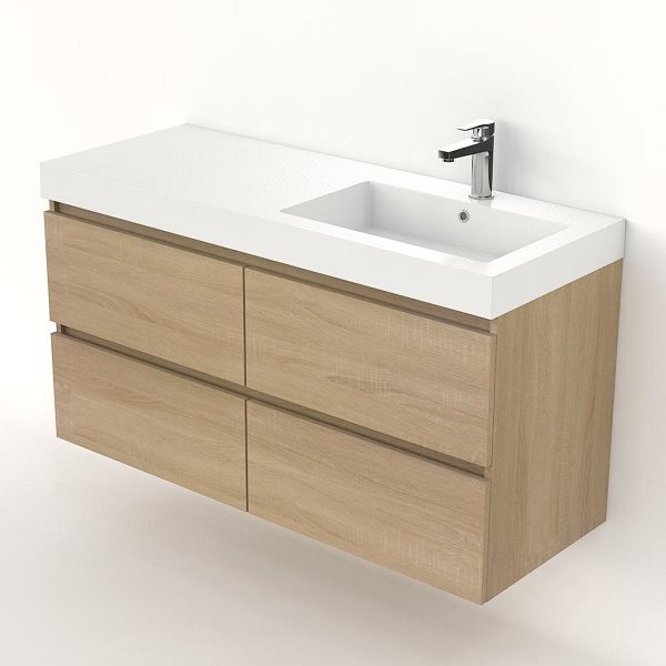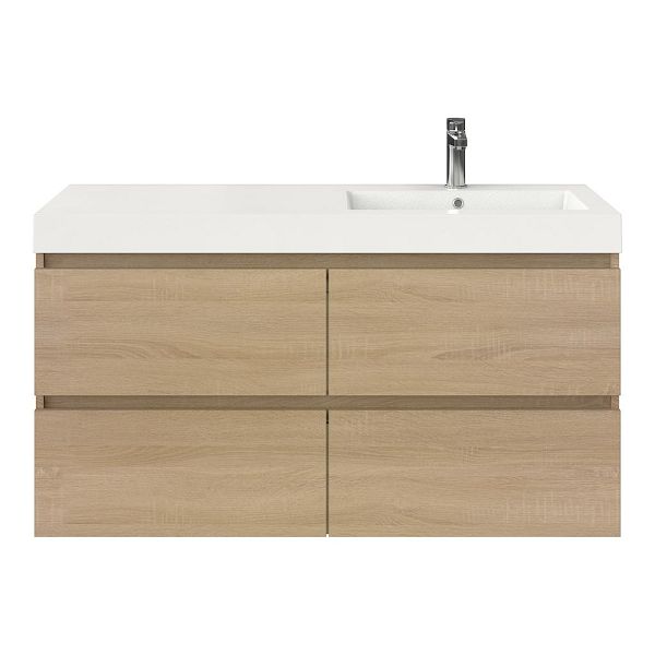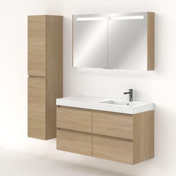 Greeploos badkamermeubel in de kleur eiken licht is 120 cm breed.  De wastafel is vervaardig in polystone en heeft de kleur wit. Dit badkamermeubel met deze wastafel is leverbaar tussen de 60 cm t/m 200 cm