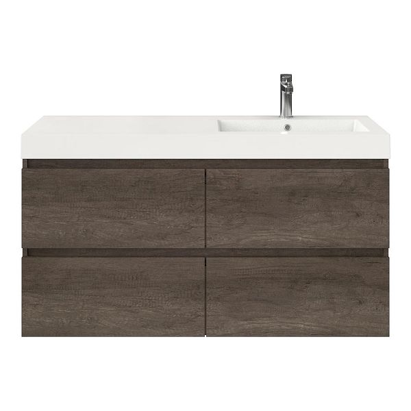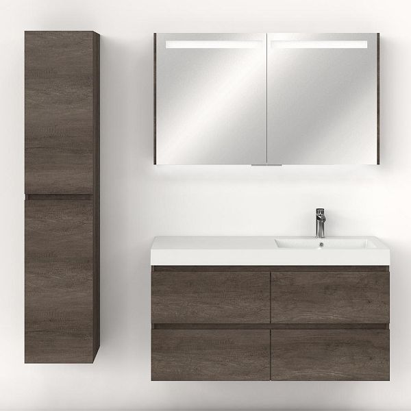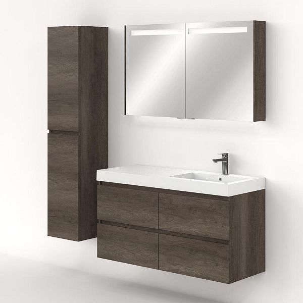 Greeploos badkamermeubel in de kleur olm donker grijs is 120 cm breed. De wastafel is vervaardig in polystone en heeft de kleur wit. Dit badkamermeubel met deze wastafel is leverbaar tussen de 60 cm t/m 200 cm