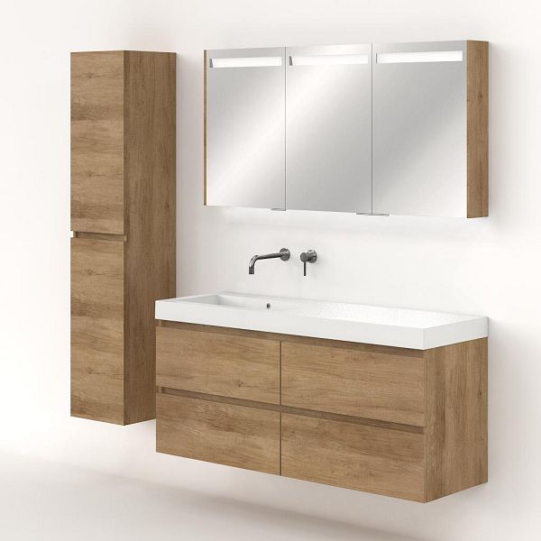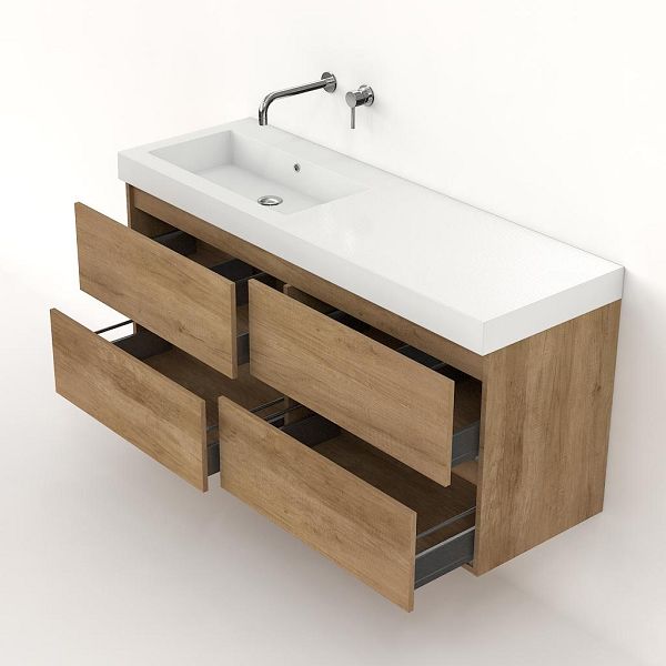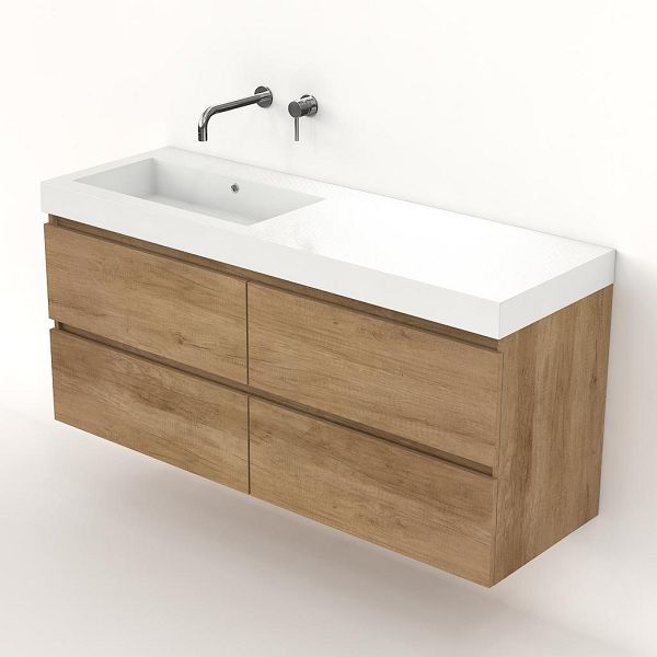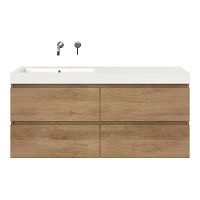 Greeploos badkamermeubel in de kleur olm is 140 cm breed.  De wastafel is vervaardig in polystone en heeft de kleur wit. Dit badkamermeubel met deze wastafel is leverbaar tussen de 60 cm t/m 200 cm