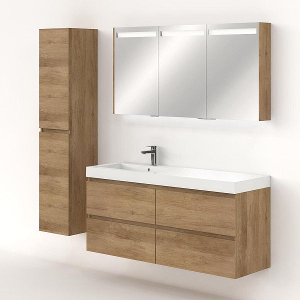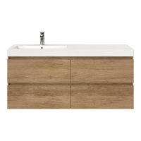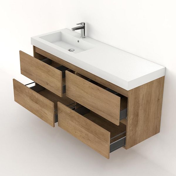 Greeploos badkamermeubel in de kleur olm is 140 cm breed.  De wastafel is vervaardig in polystone en heeft de kleur wit. Dit badkamermeubel met deze wastafel is leverbaar tussen de 60 cm t/m 200 cm