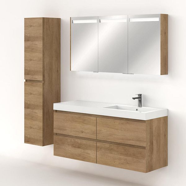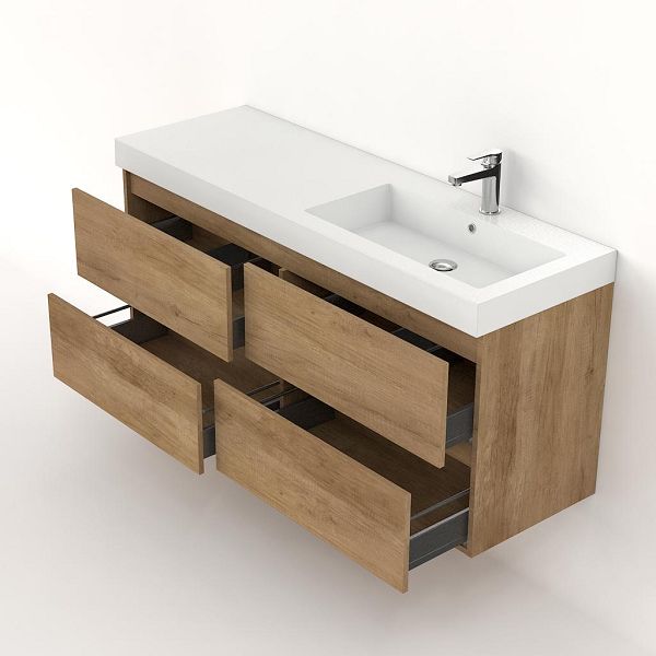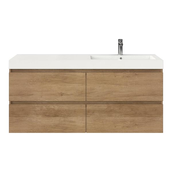 Greeploos badkamermeubel in de kleur olm is 140 cm breed.  De wastafel is vervaardig in polystone en heeft de kleur wit. Dit badkamermeubel met deze wastafel is leverbaar tussen de 60 cm t/m 200 cm