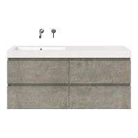 Greeploos badkamermeubel in de kleur beton structuur is 140 cm breed.  De wastafel is vervaardig in polystone en heeft de kleur wit. Dit badkamermeubel met deze wastafel is leverbaar tussen de 60 cm t/m 200 cm