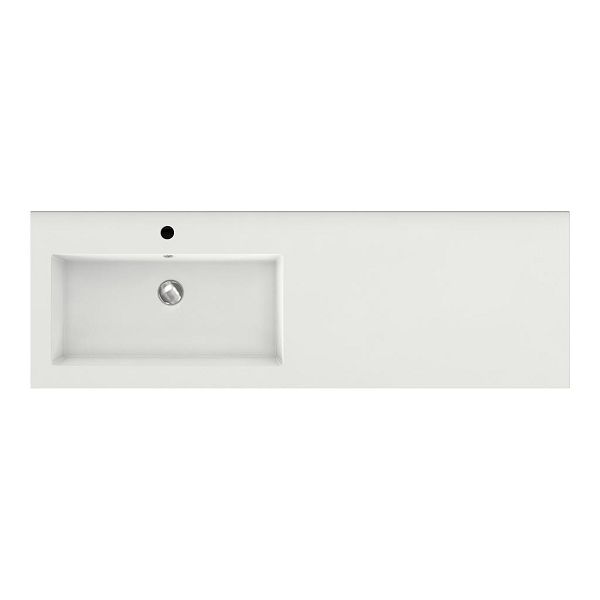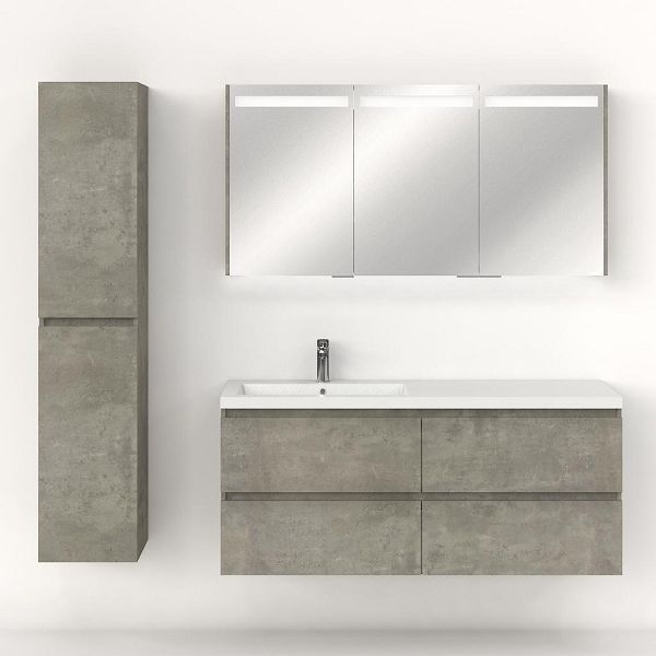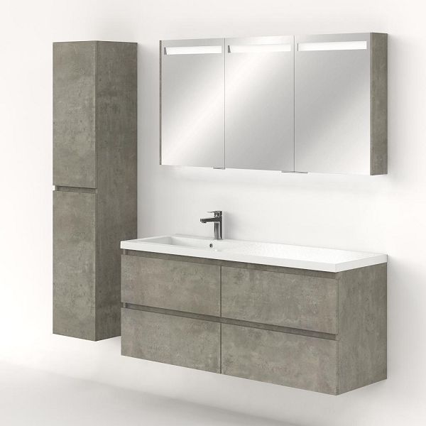 Greeploos badkamermeubel in de kleur beton structuur is 140 cm breed. De wastafel is vervaardig in polystone en heeft de kleur wit. Dit badkamermeubel met deze wastafel is leverbaar tussen de 60 cm t/m 200 cm