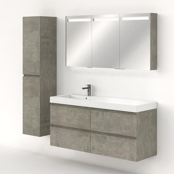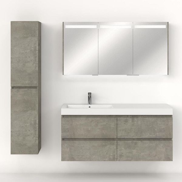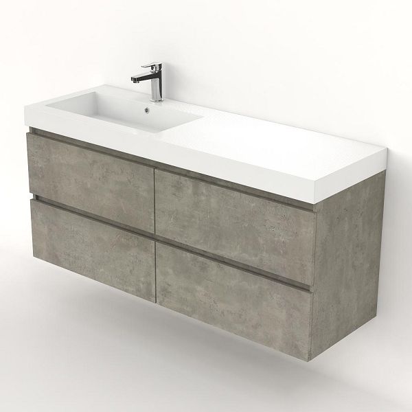Greeploos badkamermeubel in de kleur beton structuur is 140 cm breed.  De wastafel is vervaardig in polystone en heeft de kleur wit. Dit badkamermeubel met deze wastafel is leverbaar tussen de 60 cm t/m 200 cm