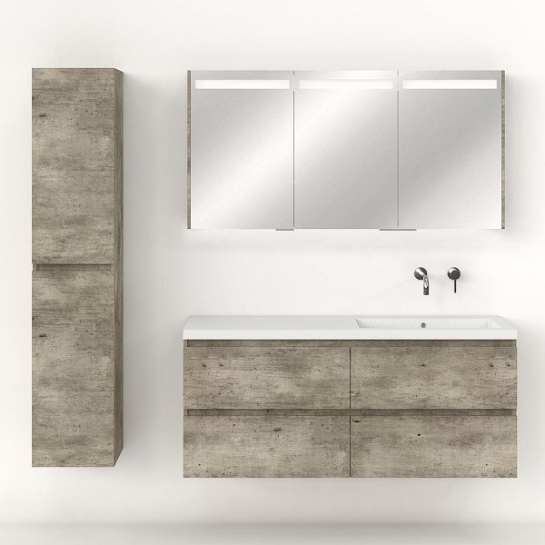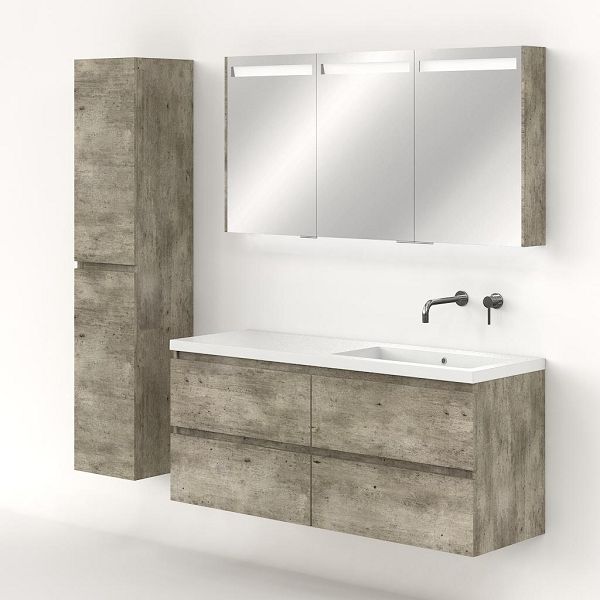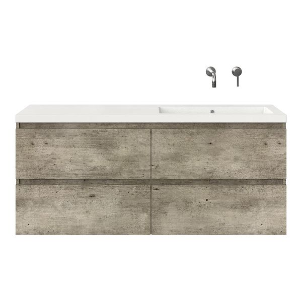 Greeploos badkamermeubel in de kleur steigerhout licht grijs is 140 cm breed.  De wastafel is vervaardig in polystone en heeft de kleur wit. Dit badkamermeubel met deze wastafel is leverbaar tussen de 60 cm t/m 200 cm