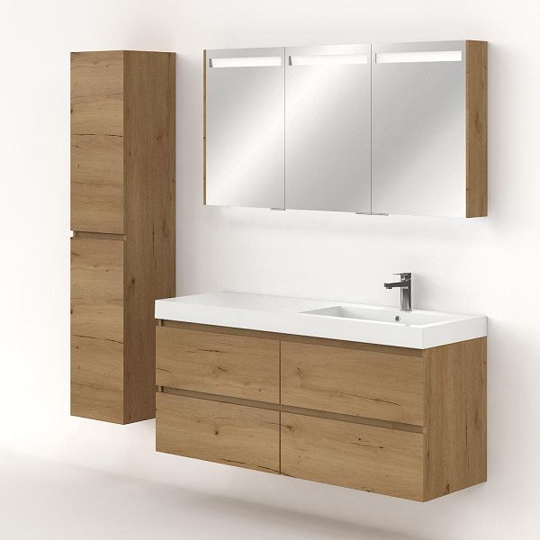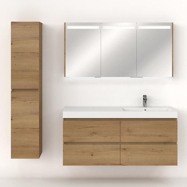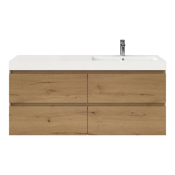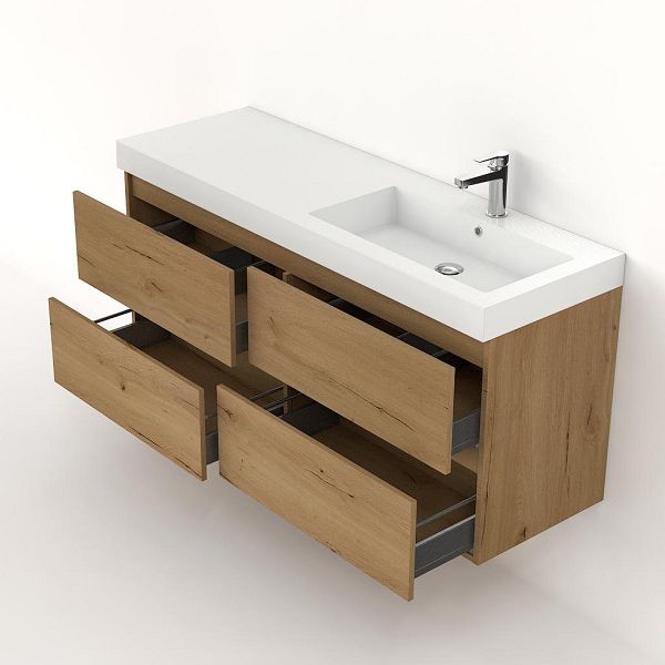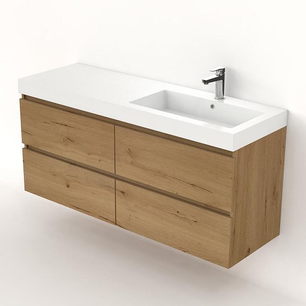 Greeploos badkamermeubel in de kleur eiken natuur is 140 cm breed.  De wastafel is vervaardig in polystone en heeft de kleur wit. Dit badkamermeubel met deze wastafel is leverbaar tussen de 60 cm t/m 200 cm