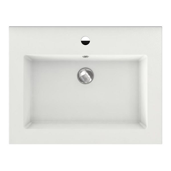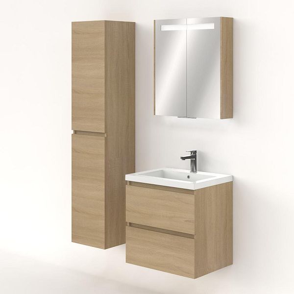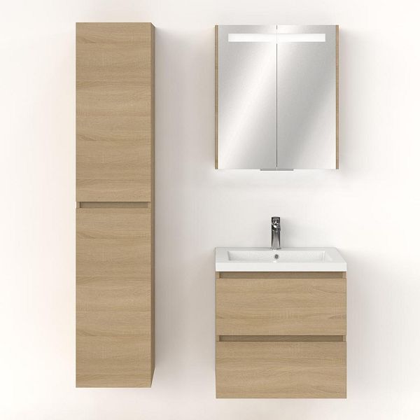Greeploos badkamermeubel in de kleur eiken licht is 60 cm breed. De wastafel is vervaardig in polystone en heeft de kleur wit. Dit badkamermeubel met deze wastafel is leverbaar tussen de 60 cm t/m 200 cm