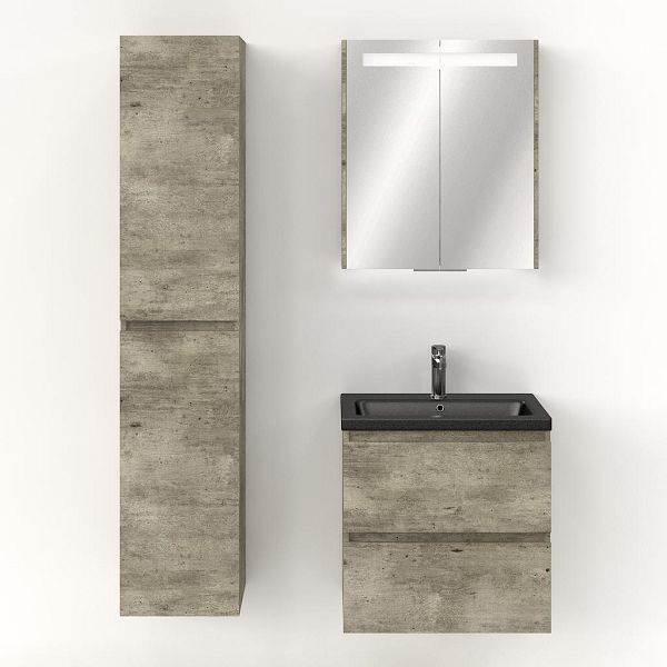 Greeploos badkamermeubel in de kleur steigerhout licht grijs is 60 cm breed. De wastafel is vervaardig in keramiek en heeft de kleur zwart mat keramiek. Dit badkamermeubel met deze wastafel is leverbaar tussen de 60 cm t/m 120 cm