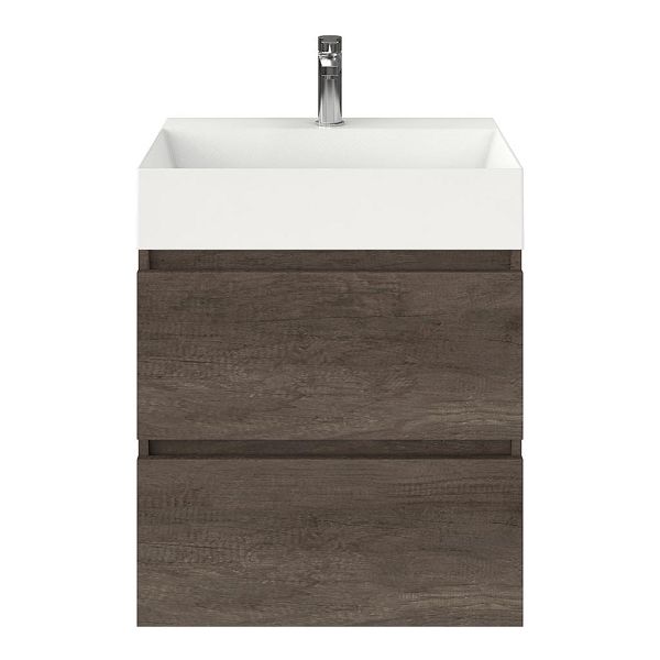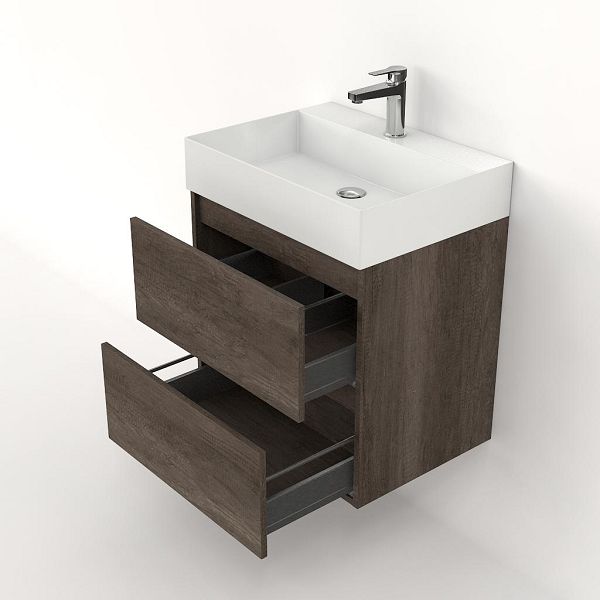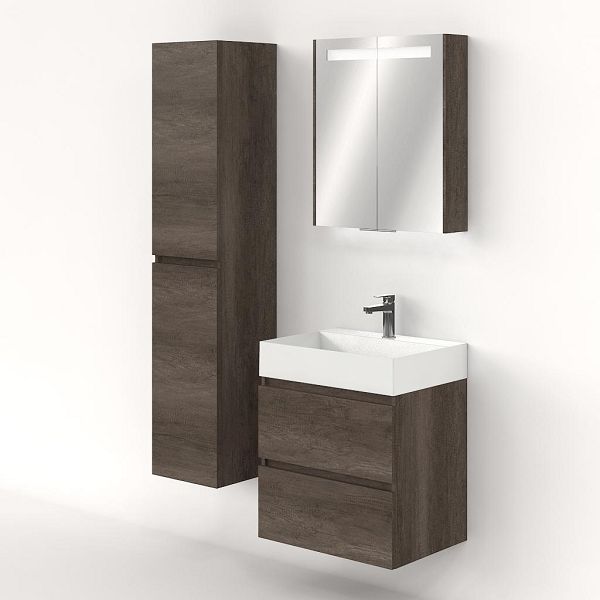 Greeploos badkamermeubel in de kleur olm donker grijs is 60 cm breed. De wastafel is vervaardig in keramiek en heeft de kleur wit keramiek. Dit badkamermeubel met deze wastafel is leverbaar tussen de 60 cm t/m 120 cm