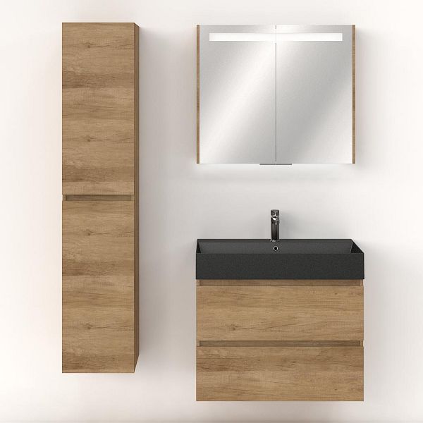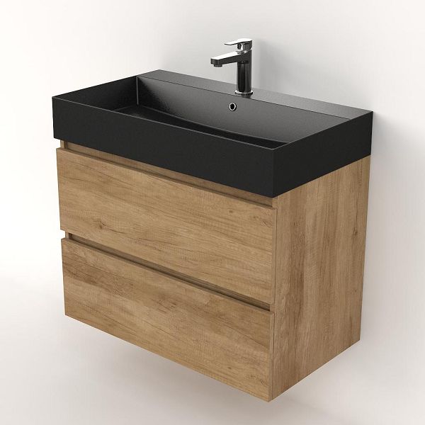 Greeploos badkamermeubel in de kleur olm is 80 cm breed. De wastafel is vervaardig in keramiek en heeft de kleur antraciet mat keramiek. Dit badkamermeubel met deze wastafel is leverbaar tussen de 60 cm t/m 120 cm