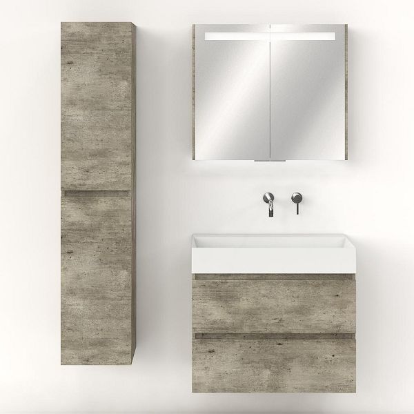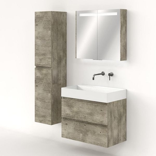 Greeploos badkamermeubel in de kleur steigerhout licht grijs is 80 cm breed. De wastafel is vervaardig in keramiek en heeft de kleur wit keramiek. Dit badkamermeubel met deze wastafel is leverbaar tussen de 60 cm t/m 120 cm
