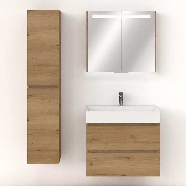 Greeploos badkamermeubel in de kleur eiken natuur is 80 cm breed. De wastafel is vervaardig in keramiek en heeft de kleur wit keramiek. Dit badkamermeubel met deze wastafel is leverbaar tussen de 60 cm t/m 120 cm