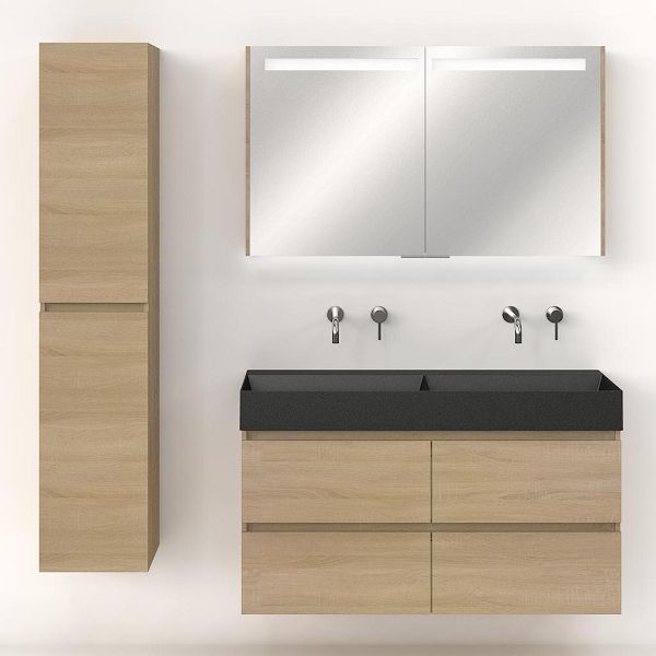 Greeploos badkamermeubel in de kleur eiken licht is 120 cm breed. De wastafel is vervaardig in keramiek en heeft de kleur antraciet mat keramiek. Dit badkamermeubel met deze wastafel is leverbaar tussen de 60 cm t/m 120 cm