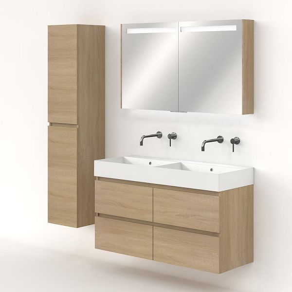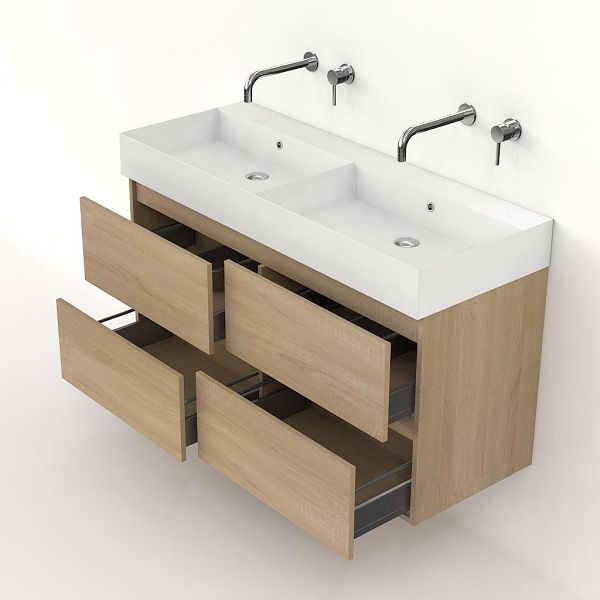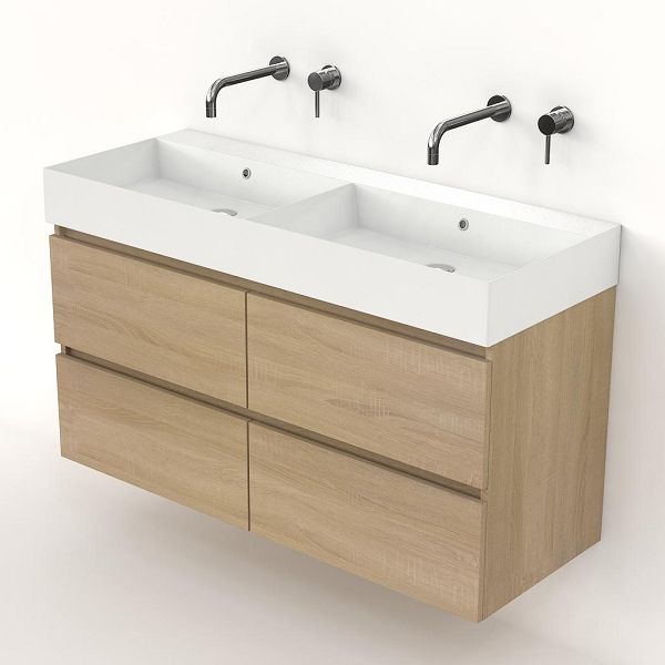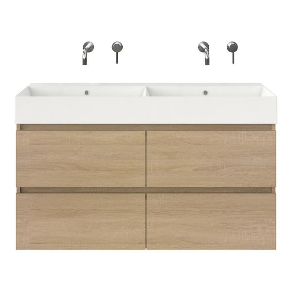 | | Bellanti Elena/Azzurra badmeubel 120x46 4 softclose laden eiken licht greeploos keramische wastafel dubbel wit glans zonder kraangaten |