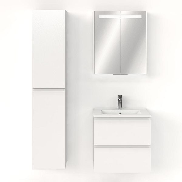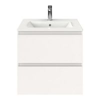 Greeploos badkamermeubel in de kleur wit hoogglans is 60 cm breed. De wastafel is vervaardig in keramiek en heeft de kleur wit keramiek. Dit badkamermeubel met deze wastafel is leverbaar tussen de 60 cm t/m 120 cm