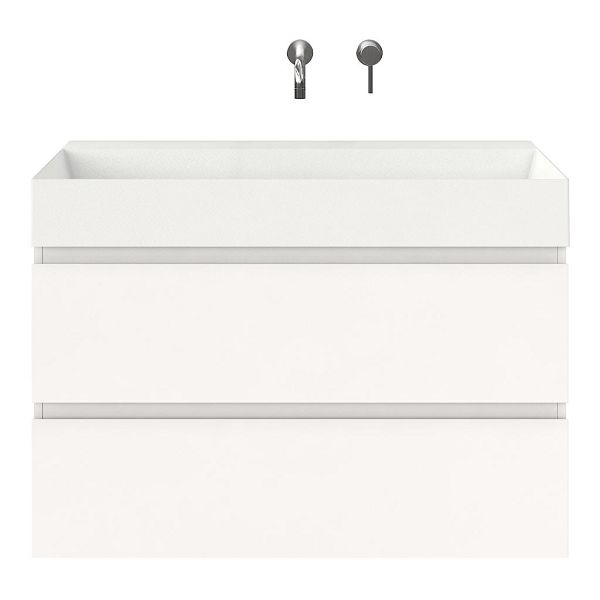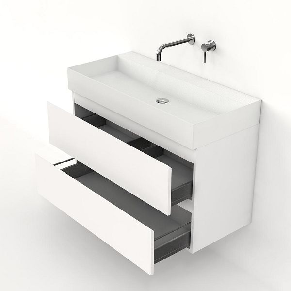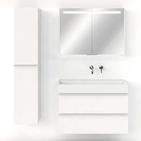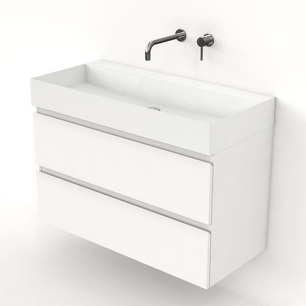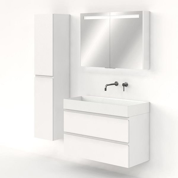 Greeploos badkamermeubel in de kleur wit mat is 100 cm breed. De wastafel is vervaardig in keramiek en heeft de kleur wit mat keramiek. Dit badkamermeubel met deze wastafel is leverbaar tussen de 60 cm t/m 160 cm