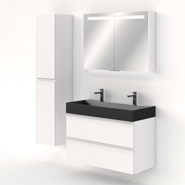 Greeploos badkamermeubel in de kleur wit mat is 100 cm breed. De wastafel is vervaardig in keramiek en heeft de kleur antraciet mat keramiek. Dit badkamermeubel met deze wastafel is leverbaar tussen de 60 cm t/m 160 cm
