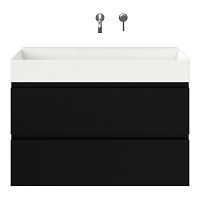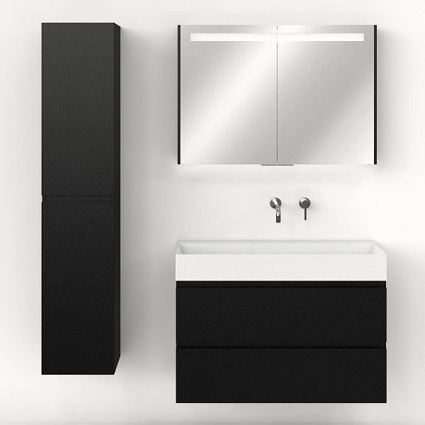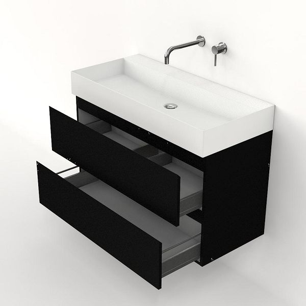 Greeploos badkamermeubel in de kleur zwart mat is 100 cm breed. De wastafel is vervaardig in keramiek en heeft de kleur wit mat keramiek. Dit badkamermeubel met deze wastafel is leverbaar tussen de 60 cm t/m 160 cm