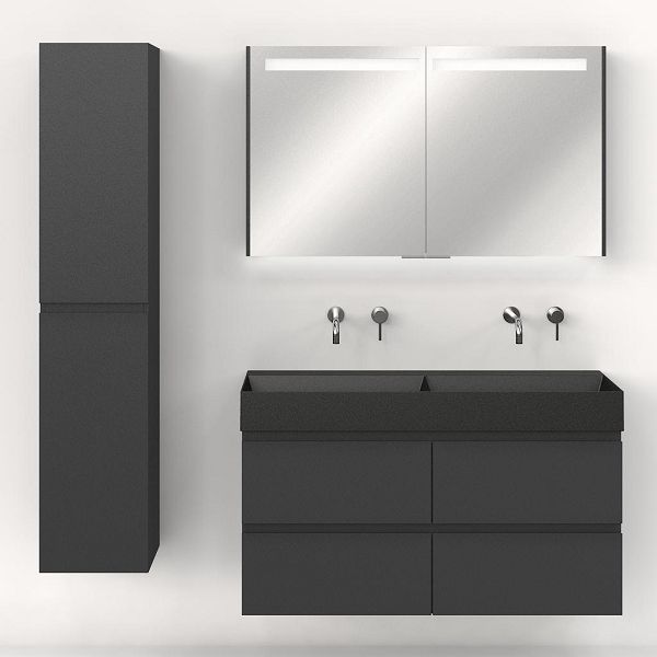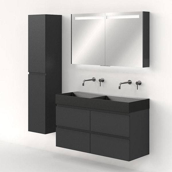 Greeploos badkamermeubel in de kleur antraciet mat is 120 cm breed. De wastafel is vervaardig in keramiek en heeft de kleur antraciet mat keramiek. Dit badkamermeubel met deze wastafel is leverbaar tussen de 60 cm t/m 160 cm