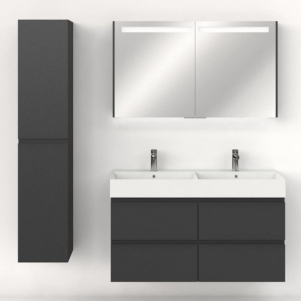 Greeploos badkamermeubel in de kleur antraciet mat is 120 cm breed. De wastafel is vervaardig in keramiek en heeft de kleur wit mat keramiek. Dit badkamermeubel met deze wastafel is leverbaar tussen de 60 cm t/m 160 cm
