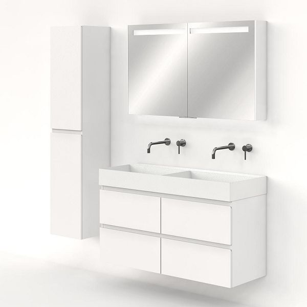 Greeploos badkamermeubel in de kleur wit mat is 120 cm breed. De wastafel is vervaardig in keramiek en heeft de kleur wit mat keramiek. Dit badkamermeubel met deze wastafel is leverbaar tussen de 60 cm t/m 160 cm