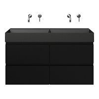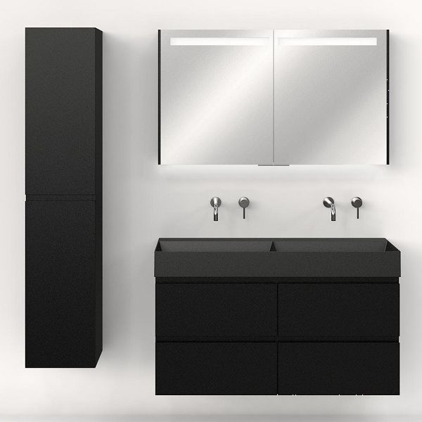 Greeploos badkamermeubel in de kleur zwart mat is 120 cm breed. De wastafel is vervaardig in keramiek en heeft de kleur antraciet mat keramiek. Dit badkamermeubel met deze wastafel is leverbaar tussen de 60 cm t/m 160 cm
